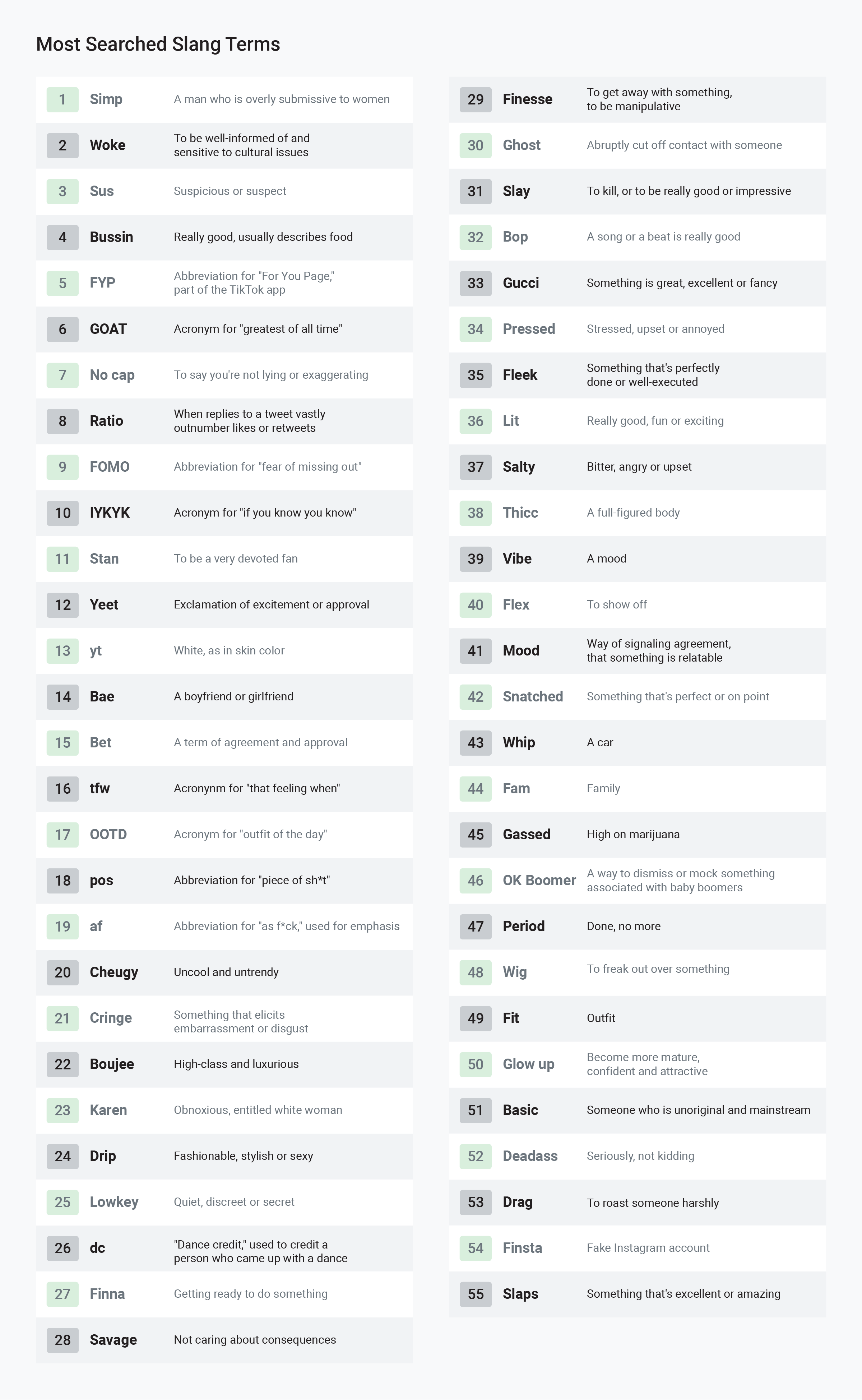 We analyzed more than 200 slang popular slang terms in Google’s AdWords platform, to establish the 55 terms that are most frequently searched by Americans, in the context of “What does mean?” The data represents rolling 12-month averages, ending in December 2021. For state-level data we look at the most unusually popular search term in each state.