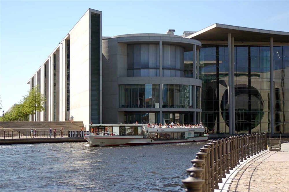 Jigsaw puzzle of A boat floating across the river in front of a modern building