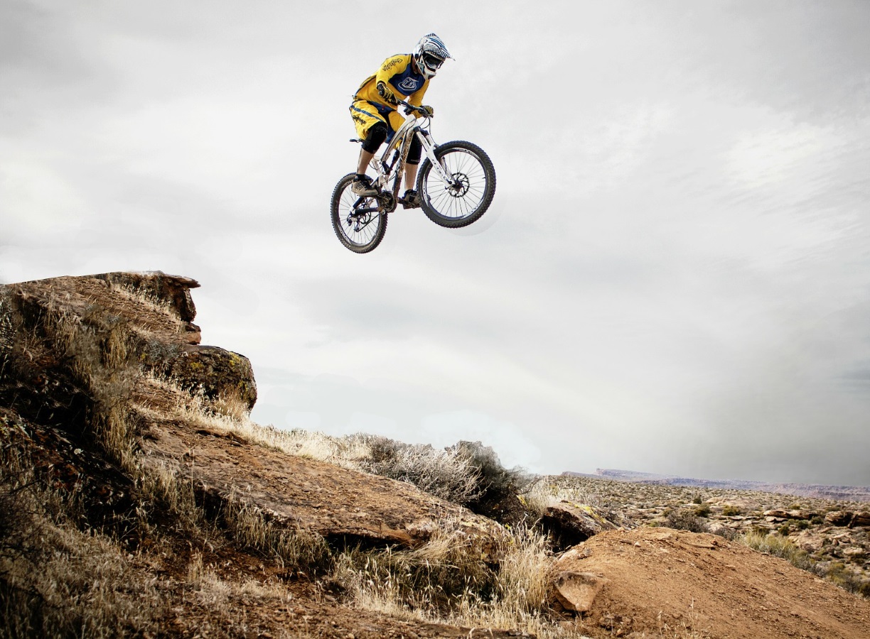 Jigsaw puzzle of a man flying through the air while riding a bicycle down a dirt road
