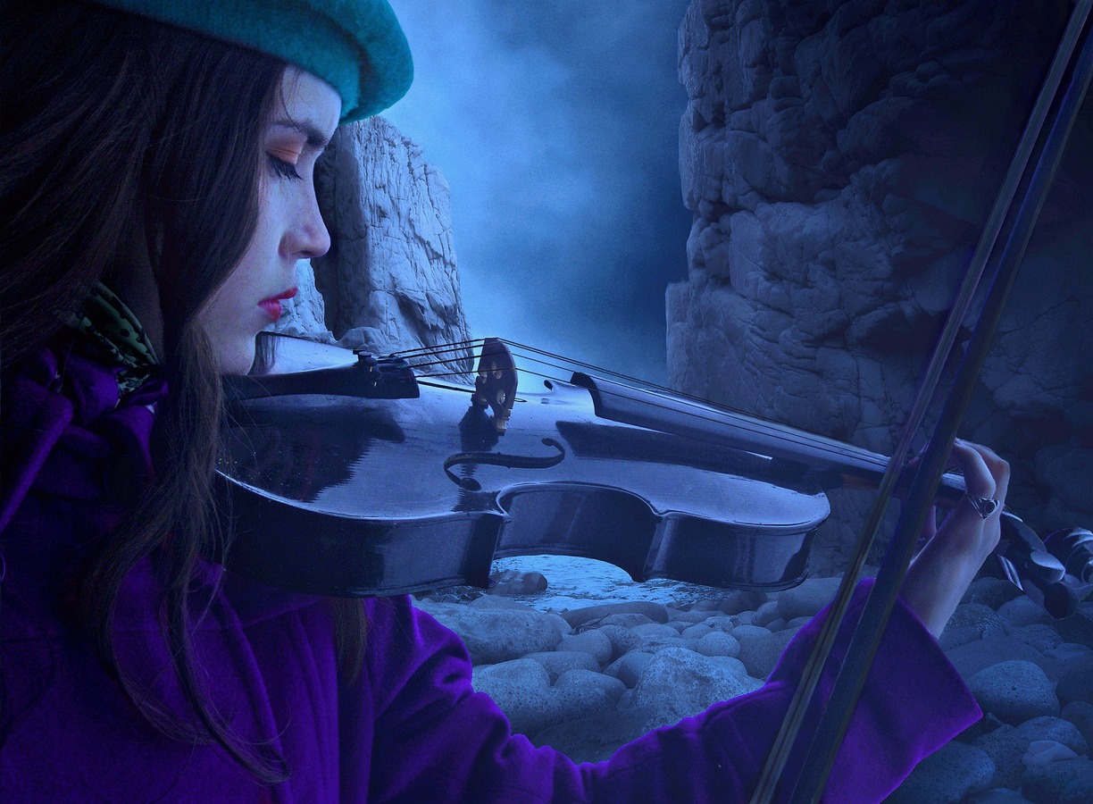 Jigsaw puzzle of a woman wearing a hat with snow on the ground and playing the violin