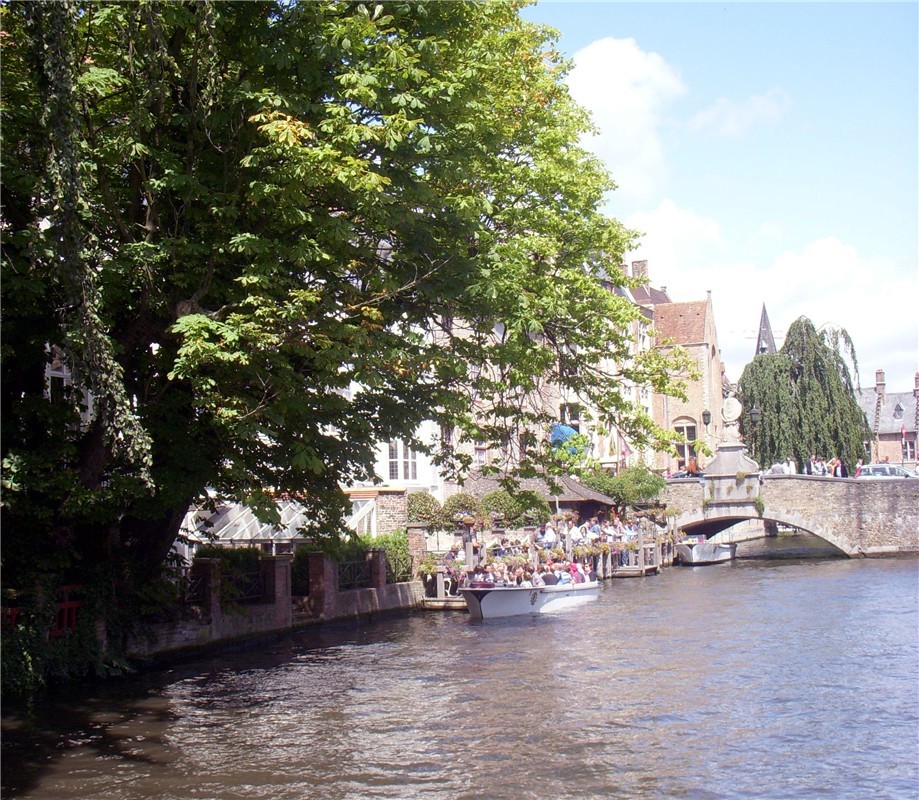 Jigsaw puzzle of a packed boat in Bruges beside a huge tree