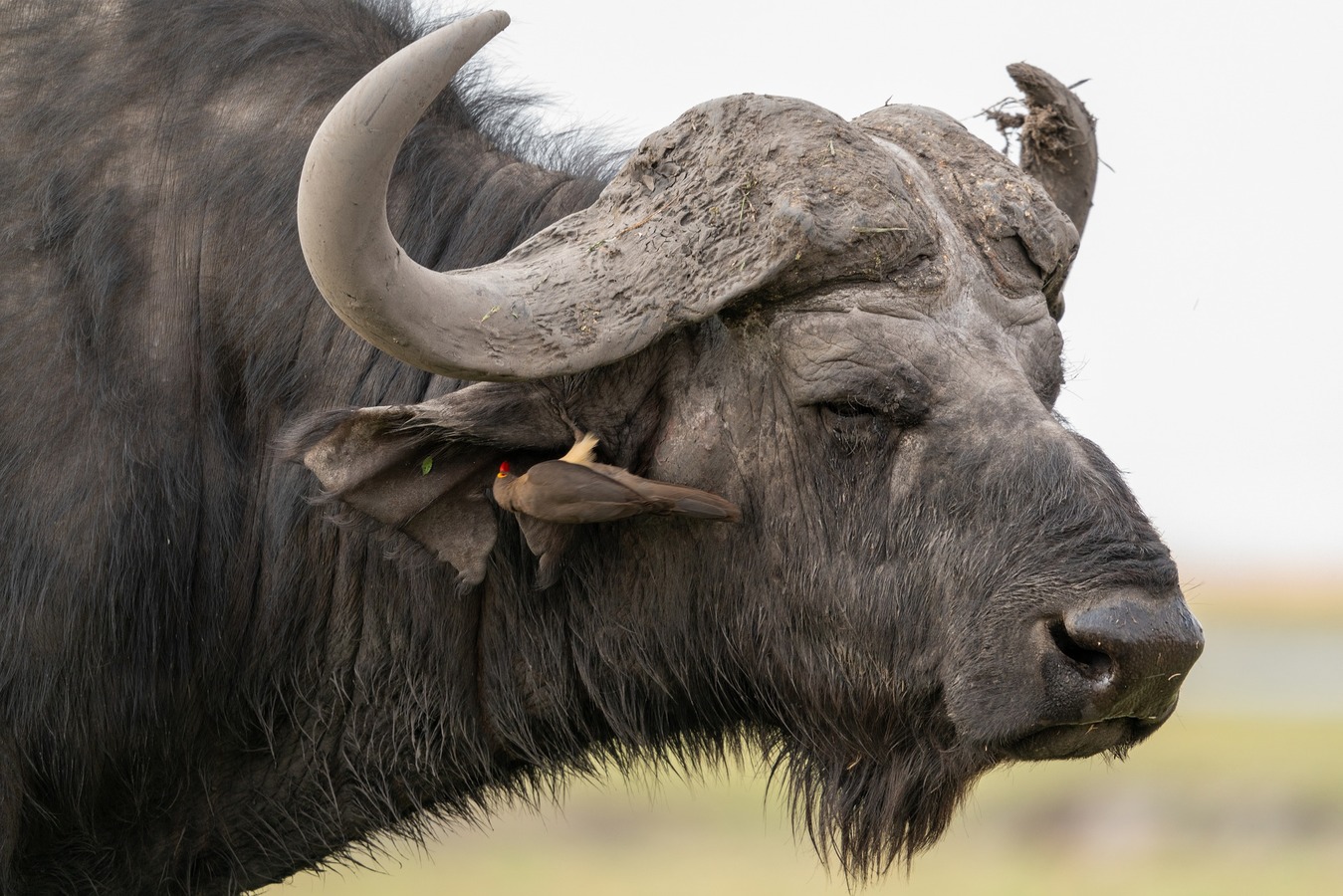 Jigsaw puzzle of a close up of a buffalo and a bird on its ear