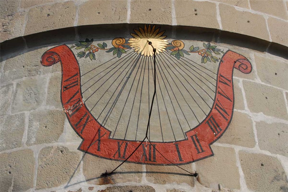 Jigsaw puzzle of a close up of an designed red clock on a brick wall