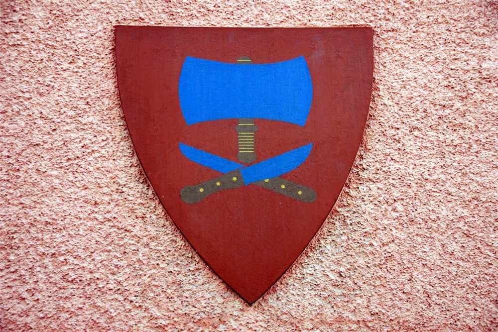 Jigsaw puzzle of a red shield with a knife design