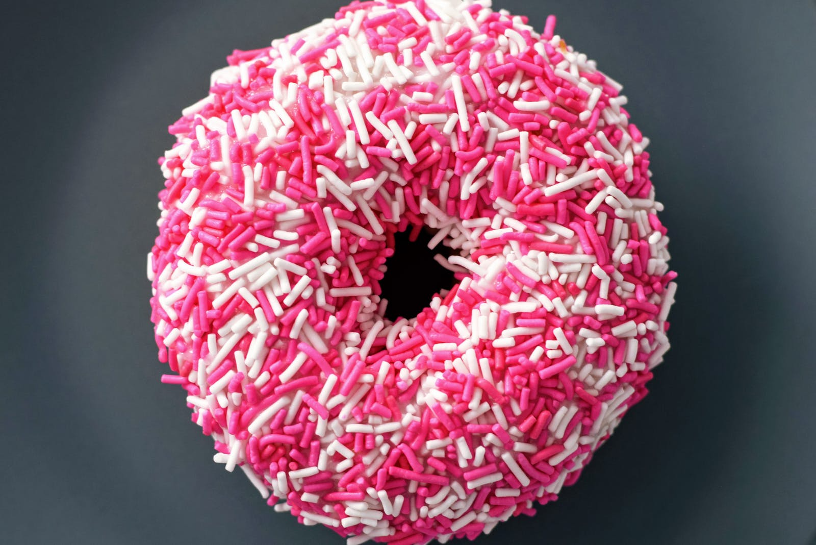 Jigsaw puzzle of Donut covered with white and pink sprinkles