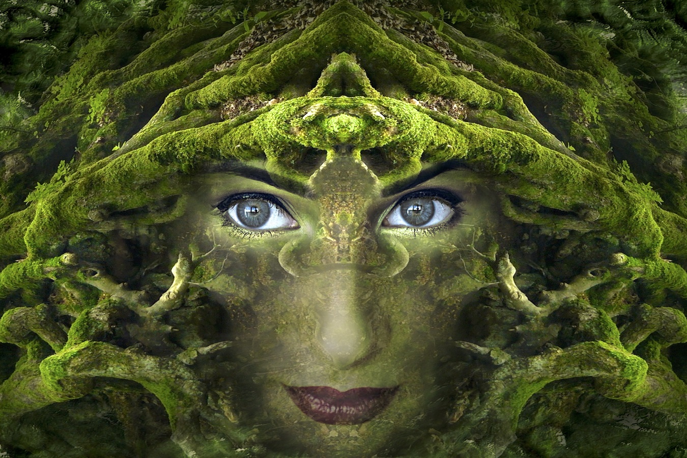 Jigsaw puzzle of a woman's face on a tree covered in moss
