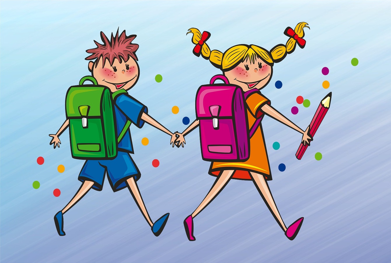 Jigsaw puzzle of two kids wearing green and pink backpacks and holding hands