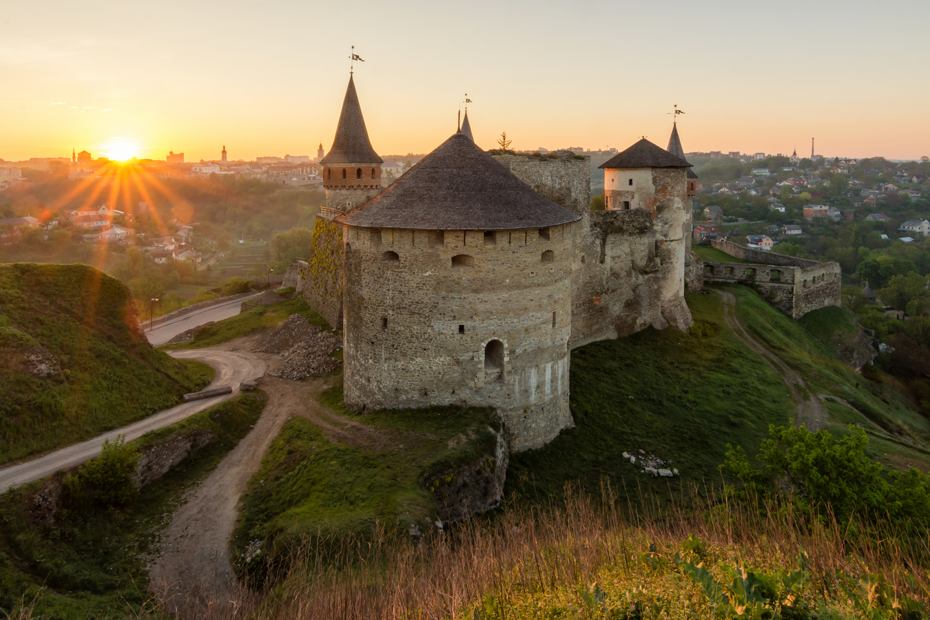 Jigsaw puzzle of a stone building surrounded nature and houses in a sunrise