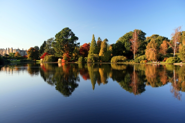 Jigsaw puzzle of a lake surrounded by colorful and huge trees