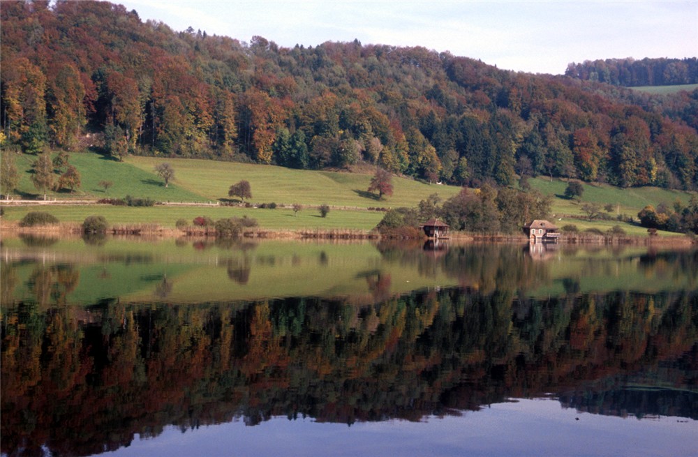 Jigsaw puzzle of A Large landscape full of trees, rivers, two houses, and its reflection