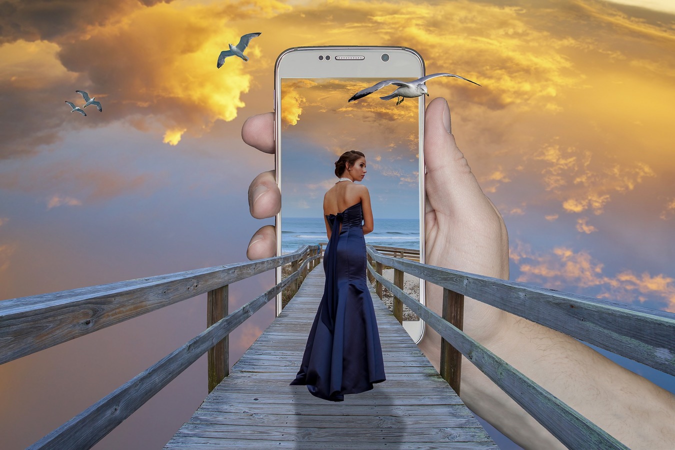 Jigsaw puzzle of a woman walking on a pier towards a photo manipulation of a phone