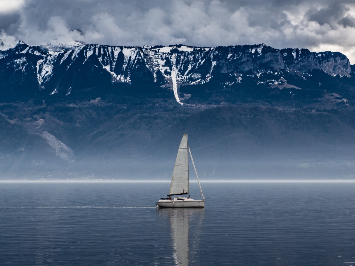 Jigsaw puzzle of a small boat in the sea with a mountain in the background