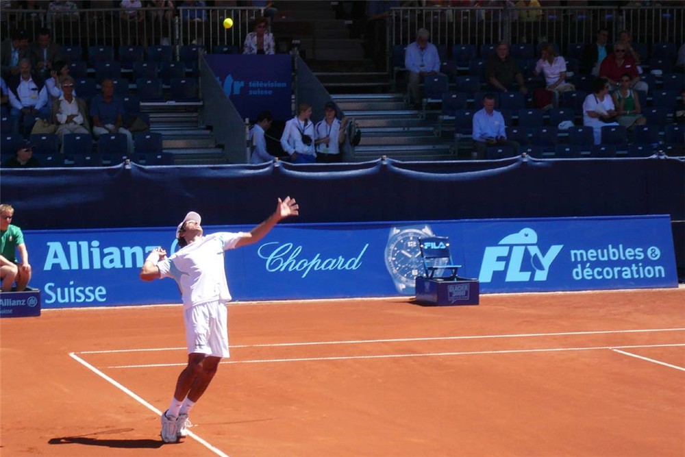 Jigsaw puzzle of a man hitting a ball with a racket on a court