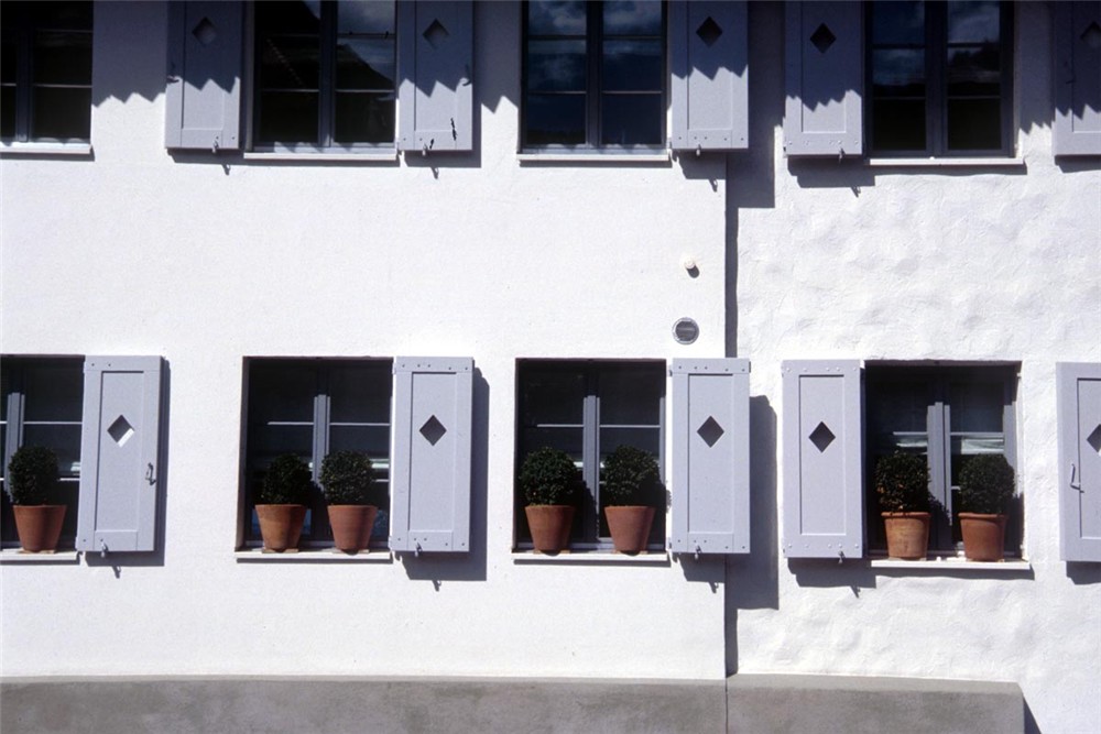 Jigsaw puzzle of windows with pots of bushes in front of them